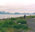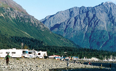 Fishermen walk out of their campers on the beach and throw in their lines at Seward. At night, there are campfires on